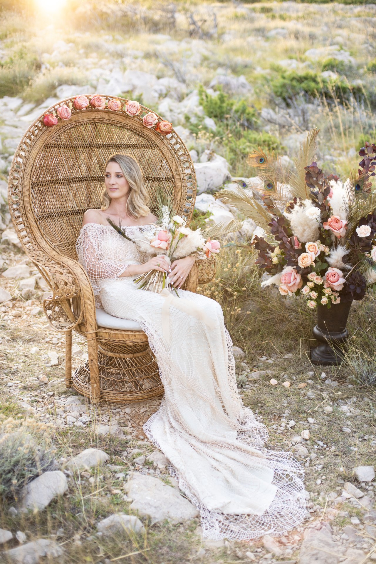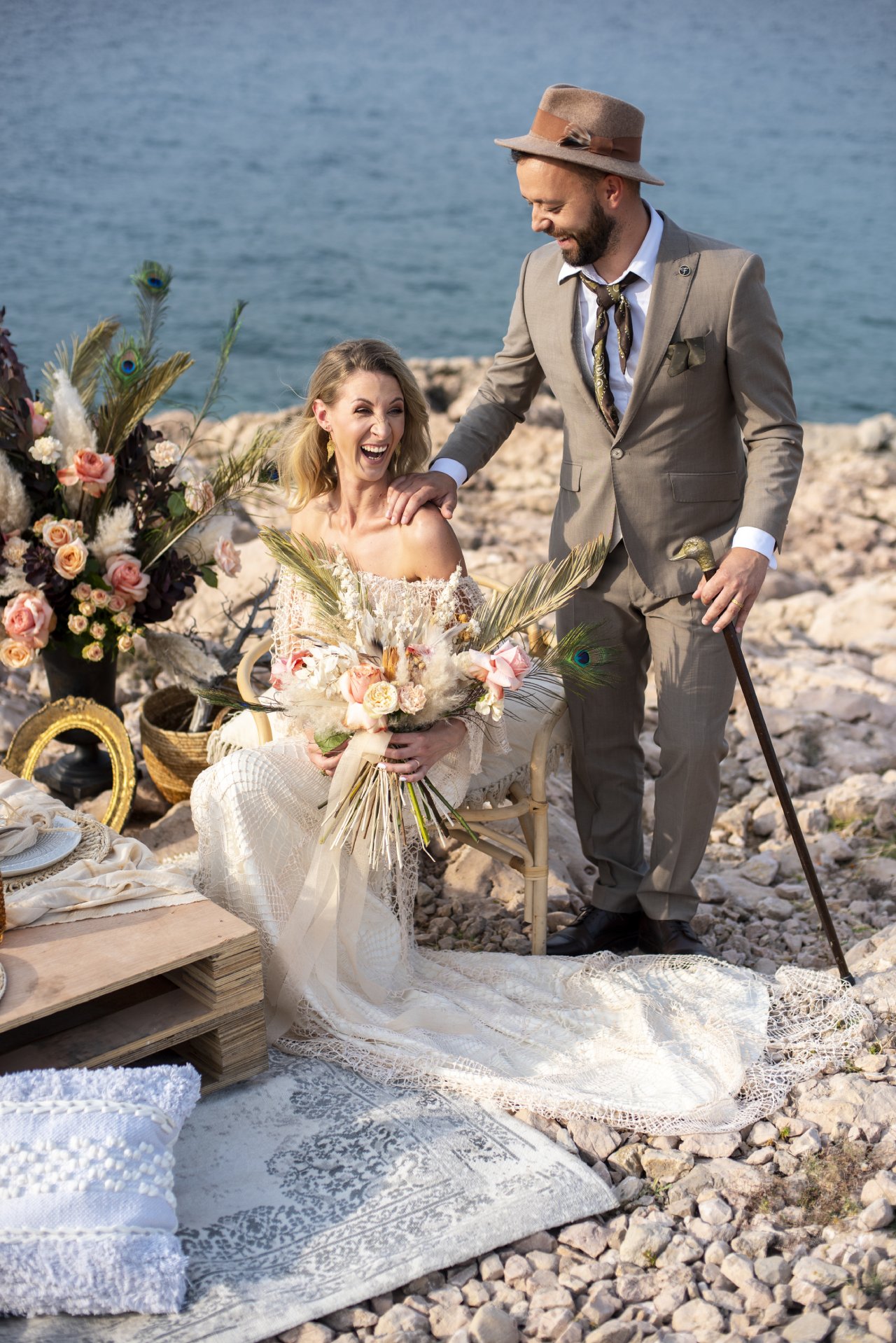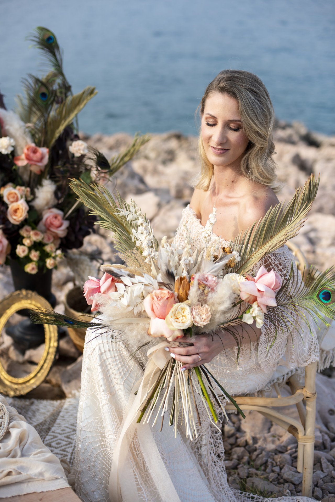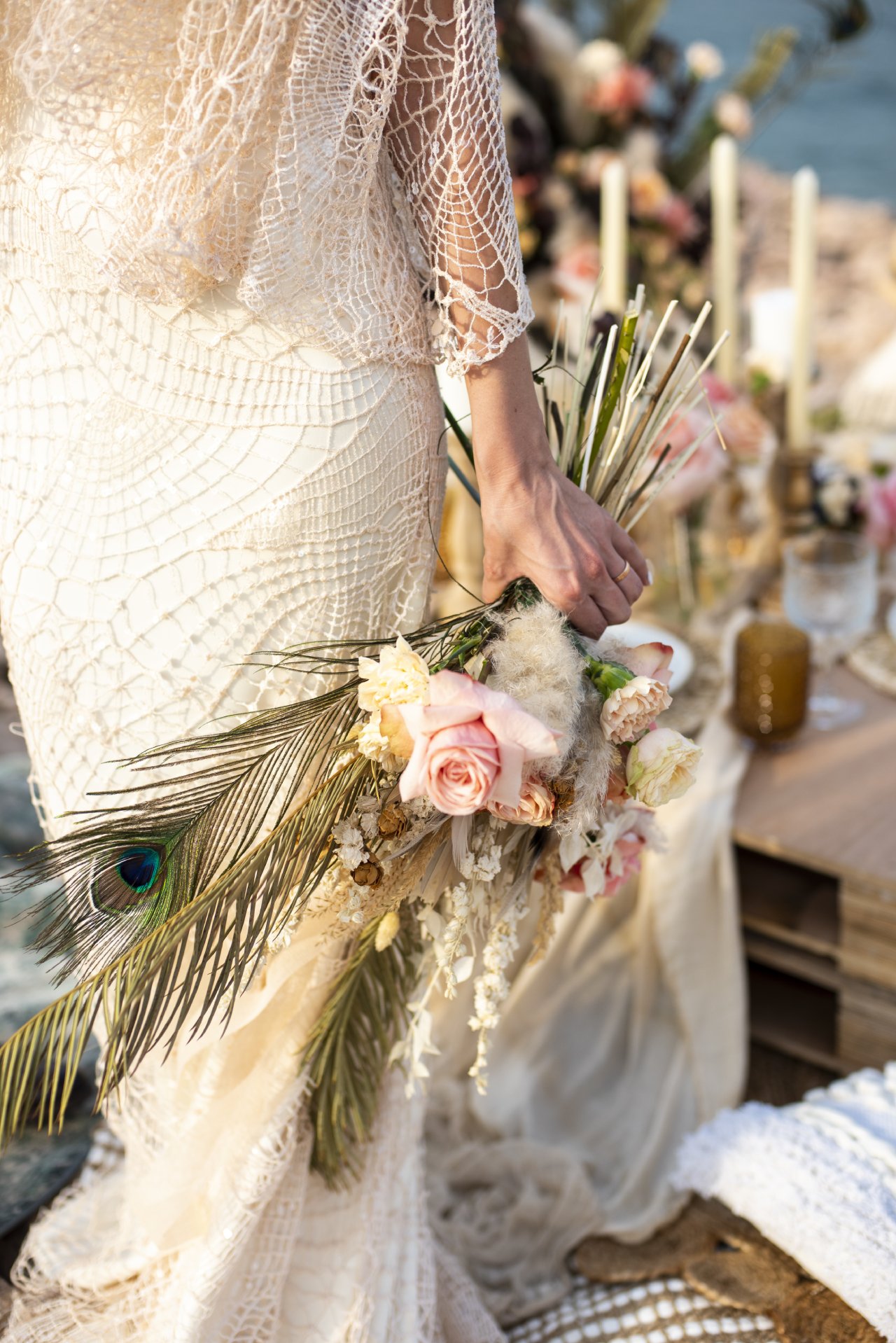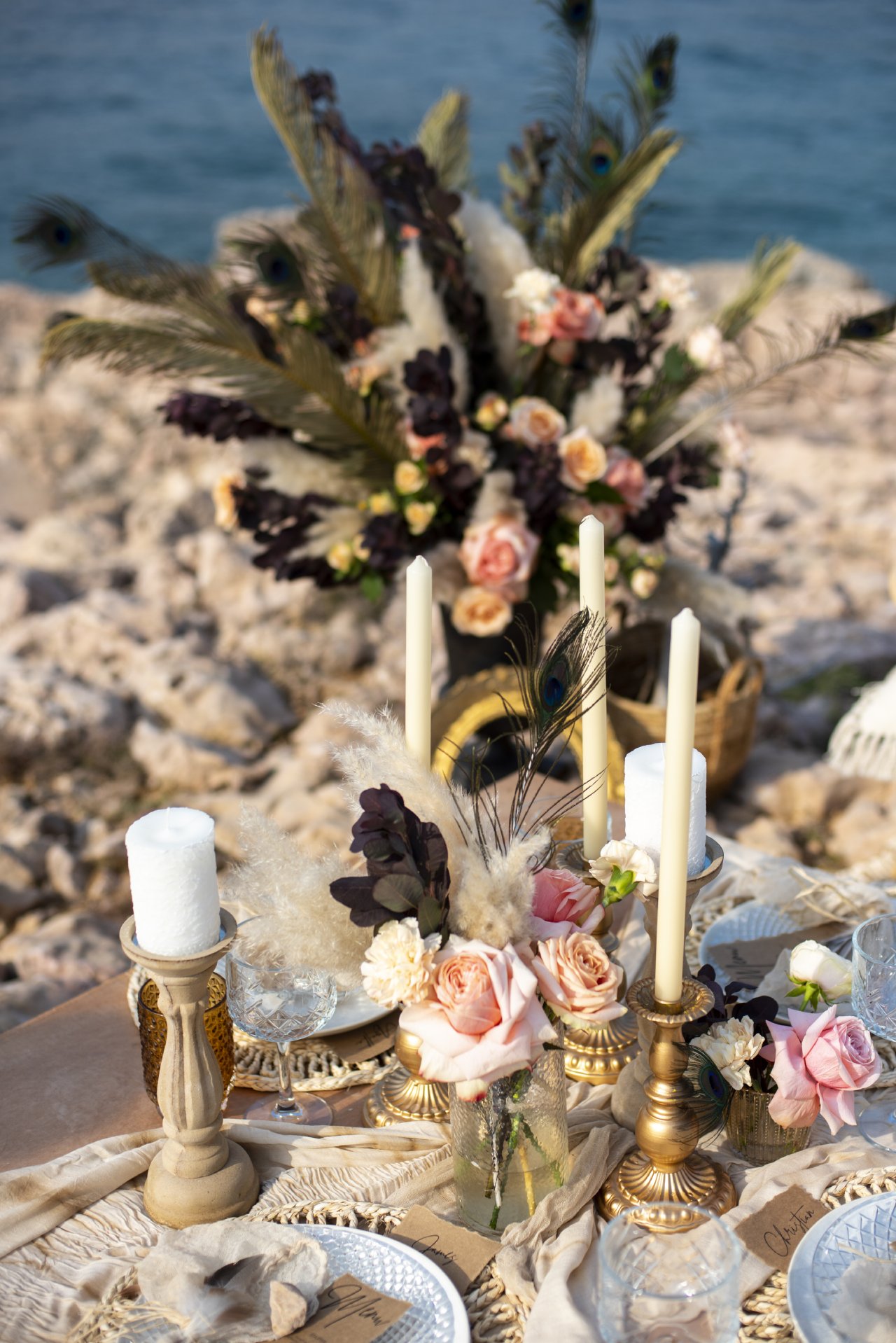 Inspiracija za dekoraciju došla je iz samog krajolika. Sve je bilo nježno, zemljano i toplo, kombinacija suhog cvijeća, perja, pampasa, puderastih ruža i zelenila s paunovim perima stvarala je savršen kontrast stjenovitoj pozadini. Umjesto tradicionalnih stolova, stvoren je boho kutak za dvoje, niski stol prekriven prirodnim tkaninama, keramikom i zlatnim čašama, okružen jastucima i rustikalnim detaljima. Sve je pozivalo na opuštanje, smijeh i dodire.