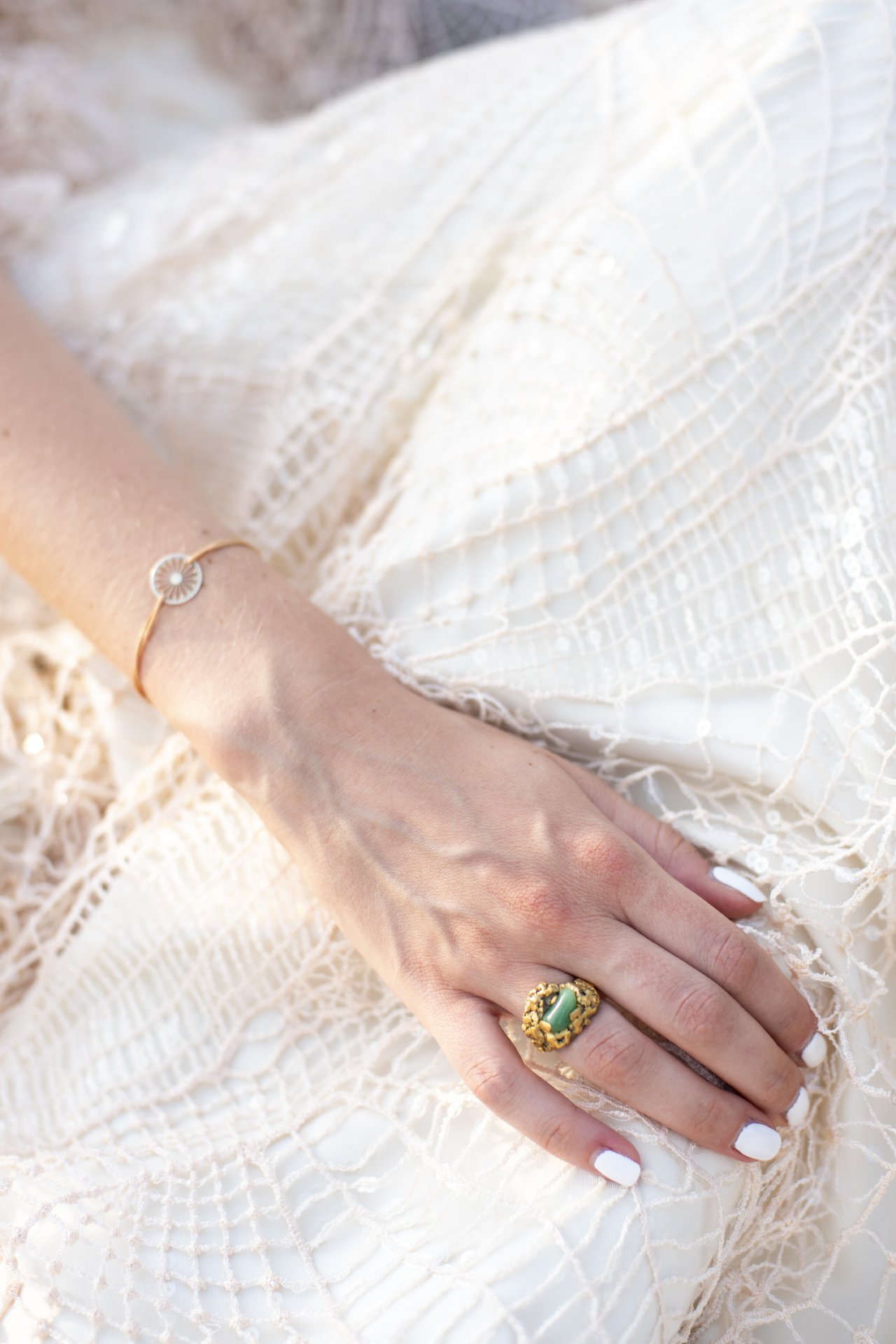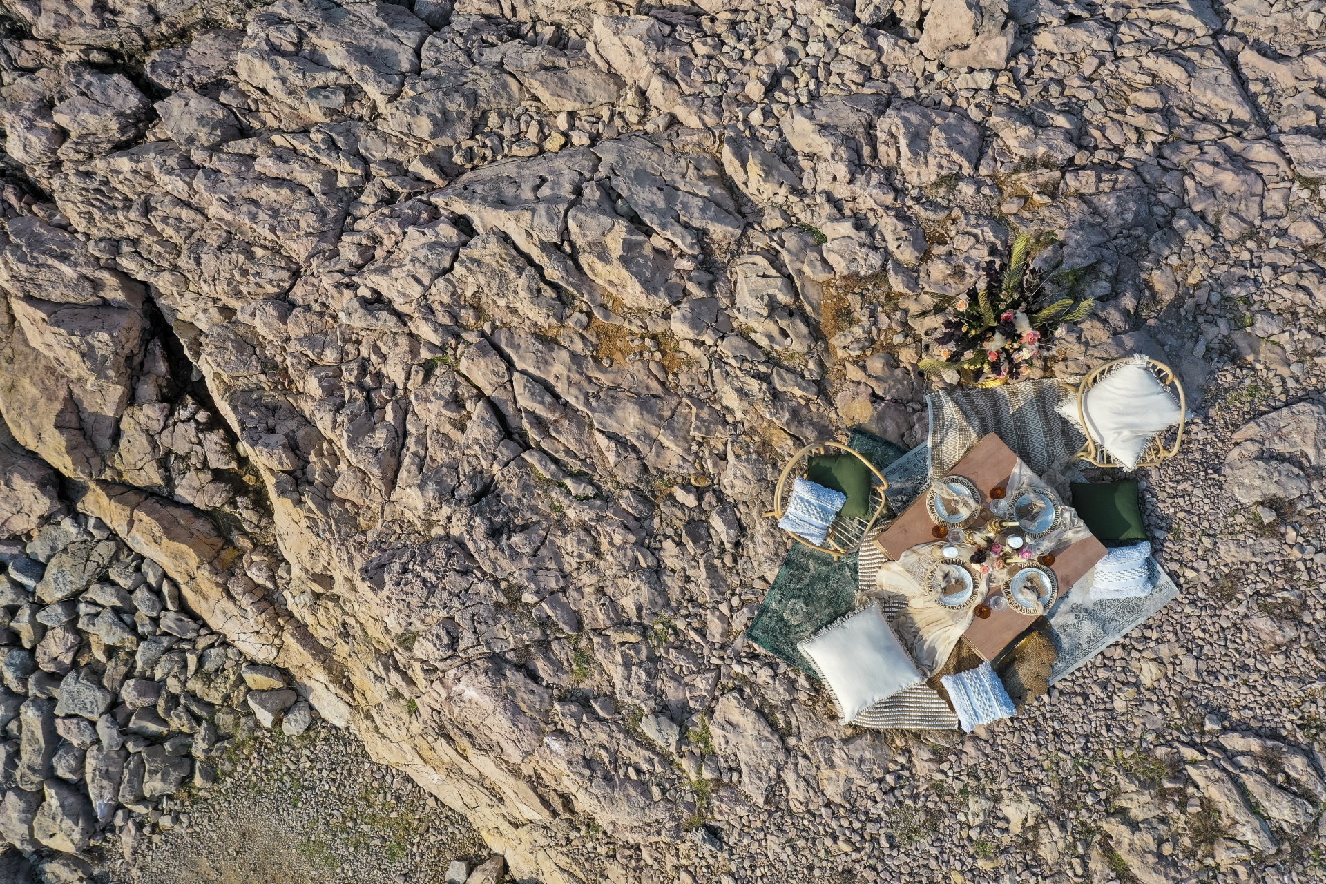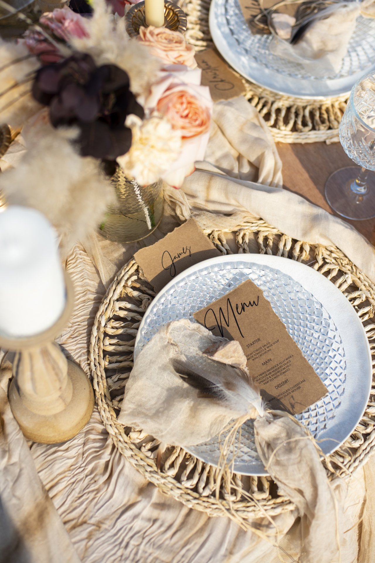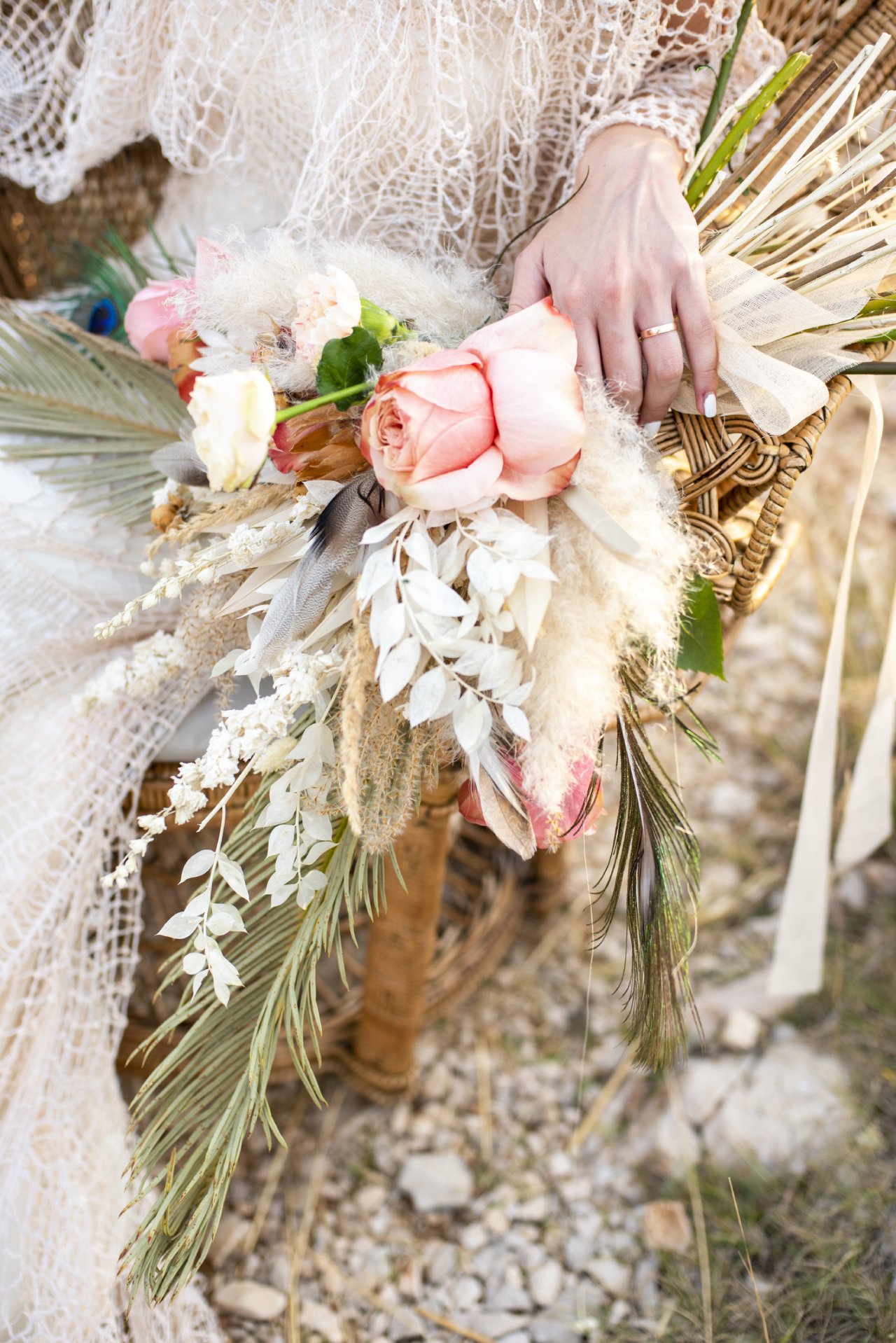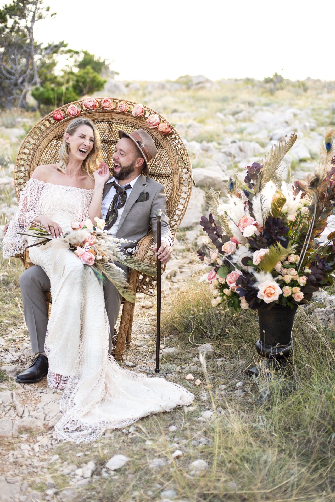 Inspiracija za dekoraciju došla je iz samog krajolika. Sve je bilo nježno, zemljano i toplo, kombinacija suhog cvijeća, perja, pampasa, puderastih ruža i zelenila s paunovim perima stvarala je savršen kontrast stjenovitoj pozadini. Umjesto tradicionalnih stolova, stvoren je boho kutak za dvoje, niski stol prekriven prirodnim tkaninama, keramikom i zlatnim čašama, okružen jastucima i rustikalnim detaljima. Sve je pozivalo na opuštanje, smijeh i dodire.