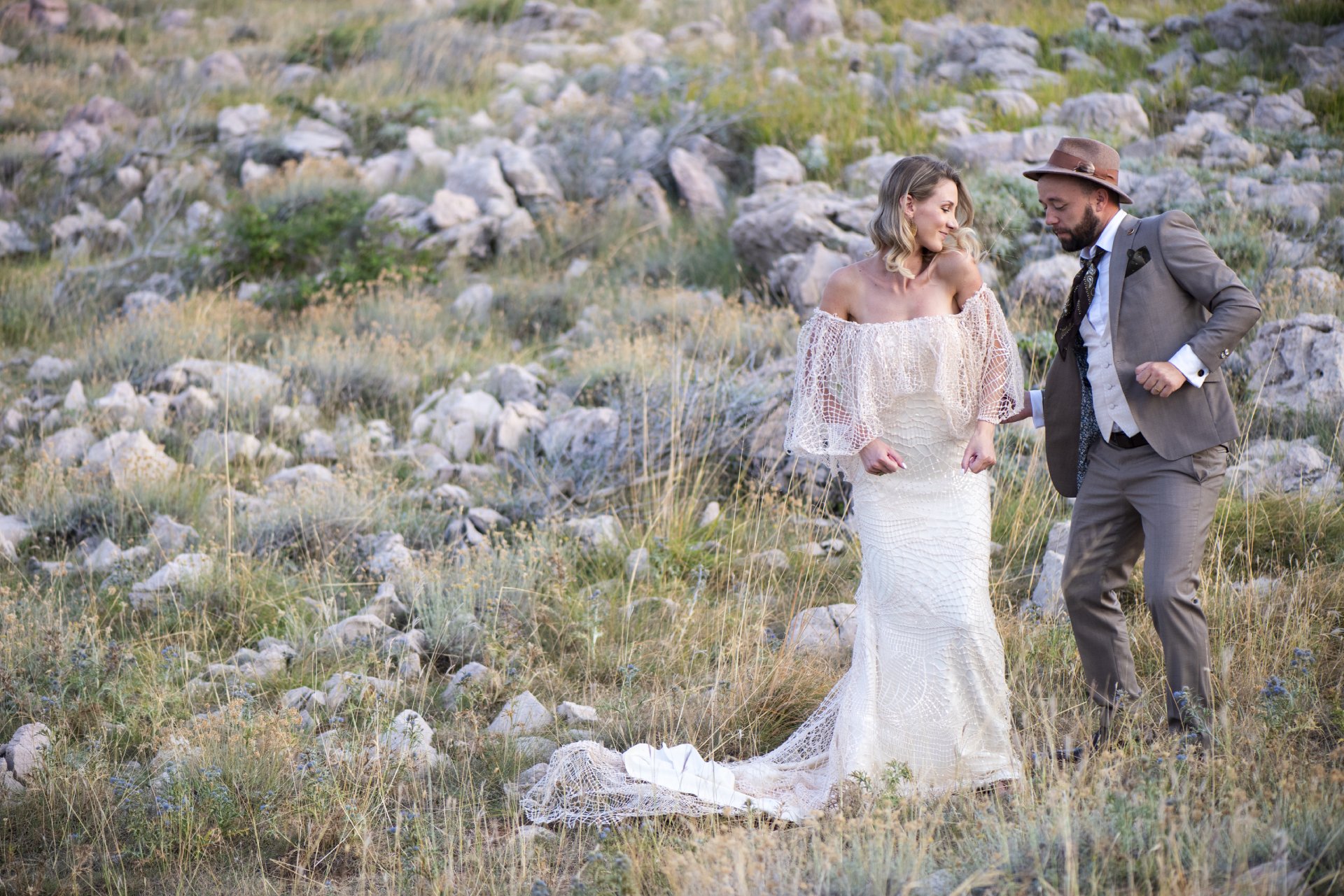 Antonela je nosila čipkastu haljinu u nijansama vanilije, s rukavima koji su lepršali na vjetru. U rukama je držala raskošan buket sastavljen od ruža, suhog bilja i paunova pera, savršeno u ravnoteži između sirovog i nježnog. Josip, u sivom odijelu s vintage šeširom i starinskim štapom, donio je dozu šarma i osobnosti koja se osjećala u svakom pogledu.