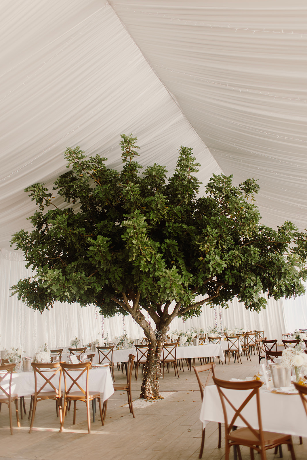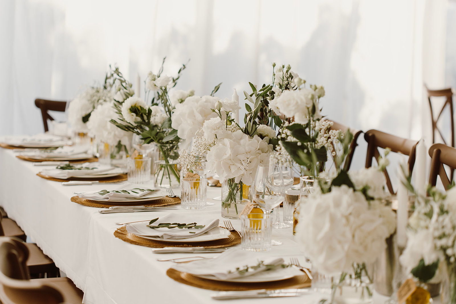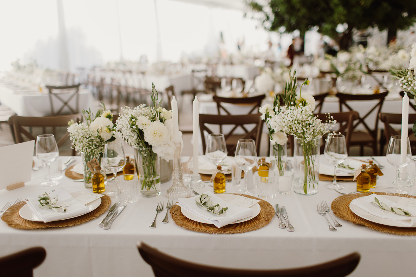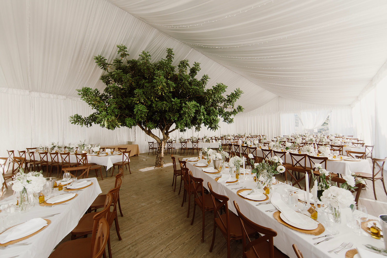 Gosti su se okupili pod veličanstvenim bijelim šatorom, obloženim mekim tkaninama i ukrašenim treperavim svjetlima, gdje je u središtu prostora ponosno stajalo stoljetno drvo, sa svojim krošnjama kao simbolom korijena i novih početaka. Dugi drveni stolovi prekriveni su bijelim platnom, zlatnim podlošcima i kristalnim čašama koje su blistale na večernjem svjetlu. Buketi bijelog cvijeća i zelenila, raspoređeni u prirodnom i profinjenom stilu, ispunili su prostor organskom elegancijom.